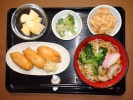 いなり寿司(甘酢しょうが)、そうめん汁(椎茸、紅かまぼこ、小松菜、長ネギ)、竹の子の土佐煮、ブロッコリーの胡麻ドレ和え、フルーツ:リンゴ |