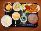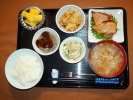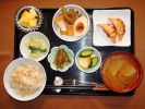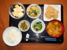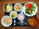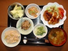 ごはん、味噌汁(白菜、しめじ、あげ)、ふりの照り焼き(大葉添え)、竹の子の土佐煮、もやし・キュウリ・竹輪の酢の物、こんにゃくの味噌田楽、フルーツ:生パイナップル |