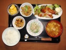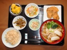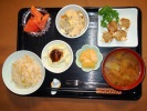 竹の子ごはん、味噌汁(白菜、えのき、しめじ)、豚カツ・とりささみ大葉フライ(千切りキャベツ、トマト)、卯の花(あげ、椎茸、人参、竹輪、さつま揚げ、長ネギ、たまご、枝豆)、茄子生姜和え(おかか)、ブロッコリーの胡麻和え、フルーツ:ハネージュメロン |
