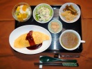 オムライス、ビーフオニオンスープ、スパゲティサラダ(レタス添え)、竹の子とふき煮、白花豆煮、フルーツ:杏仁豆腐(キュウイ、みかん缶、黄桃缶) |