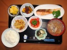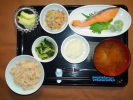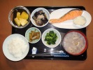 ごはん、味噌汁(白菜、しいたけ、あげ)、チリ産・鮭の塩焼き(大根おろし、甘酢しょうが)、茄子炒め(すり胡麻)、菜の花辛子和え、ふき煮、フルーツ:生のパイナップル |