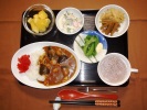 茄子ポークカレー(豚肉、揚げ茄子、玉ネギ、人参、ジャガイモ)、野菜ビーフコンソメスープ、マカロニサラダ(人参、キュウリ、ロースハム)、竹の子・ふきの煮物、スナップえんどう(マヨネーズ添え)、フルーツ:生パイナップル |