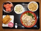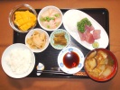 ごはん、味噌汁(白菜、椎茸、えのき、あげ)、きはだマグロの刺身(大根つま、パセリ、わさびのせキュウリ)、かぶあんかけ(カニカマ、グリーンピース)、竹の子煮、ふき煮、フルーツ:マンゴー |