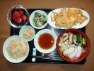 竹の子ごはん、そうめん汁(しいたけ、小松菜、紅かまぼこ、長ネギ、みょうが)、かき揚げ(玉ネギ、小エビ)、酢の物(キュウリ・ワカメ・カニカマ)、白花豆煮、フルーツ:イチゴ(練乳がけ) |