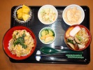親子丼(とりもも肉、玉ネギ、なると、玉子、三つ葉)、そうめん汁(椎茸、紅かまぼこ、小松菜、みょうが、長ネギ)、竹の子中華炒め(大豆フレーク)、キャベツ・人参の和え物(キュウリ、和風ドレッシング)、かぶとキュウリの一夜漬け、フルーツ:プラチナパイナップル |