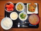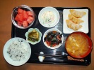 わかめごはん、味噌汁(玉ネギ、たまご)、揚げギョーザ、ポテトサラダ(キュウリ、人参、ロースハム)、トマト和風和え(白胡麻、海苔)、キュウリの中華和え、フルーツ:でんすけスイカ |