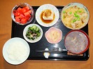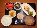 ごはん、味噌汁(白菜、あげ)、からすがれいの塩こうじ焼き、かぼちゃいとこ煮、豆腐ネバネバがけ、トマト和風和え、キュウリ中華炒め、フルーツ:スイカ(紅まくら) |