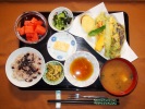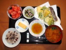 お赤飯(胡麻塩)、味噌汁(豆腐、なめこ、三つ葉)、天ぷら盛合せ(さつま芋、かぼちゃ、ししとう、オクラ、赤・黄パプリカ、いんげん、竹輪、天つゆ)、酢の物(キュウリ、ワカメ、カニカマ)、ゴーヤ炒め(豚肉、玉子)、玉子焼き、フルーツ:スイカ |