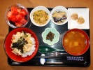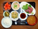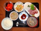 ごはん、味噌汁(茄子、椎茸、あげ、みょうが)、まぐろ刺身(めじまぐろ、インドまぐろ、大根つま、大葉、パセリ、キュウリちょいのせワサビ)、うの花(人参、椎茸、竹輪、あげ、さつま揚げ、長ネギ、たまご、枝豆)、とうがんあんけか(カニカマ、オクラ)、フルーツ:スイカ(紅まくら) |