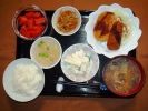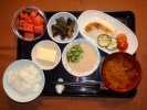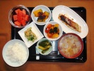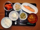 ごはん、味噌汁(とうがん、油あげ)、ノルウエー産塩さけ焼き、ポテトサラダ(人参、キュウリ、玉ネギ、コーン)、ソフト揚げ大根おろしがけ(なめ茸、オクラ)、ゴーヤ炒め(豚肉、たまご)、フルーツ:スイカ |