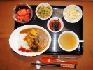 ナスポークカレーライス(豚肉、揚げ茄子、人参、玉ネギ、じゃがいも)、根菜コンソメスープ(玉ネギ、人参、じゃがいも、セロリ)、和風コールスローサラダ(キャベツ、人参、キュウリ、コーン)、ゴーヤ炒め(豚肉、たまご)、トマト和風和え(白胡麻、のり)、フルーツ:スイカ(紅まくら) |
