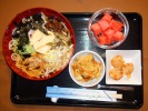 冷しうどん(細うどん、キュウリ、カニカマ、天かす、玉子焼き、椎茸煮、煮あげ、長ネギ、みょうが)、野菜たまごとじ(キャベツ、人参、玉ネギ、椎茸)、カニ風味揚げシューマイ、フルーツ:スイカ |