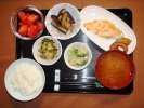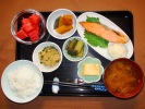 ごはん、味噌汁(白菜、椎茸)、チリ産塩鮭焼き(大葉、大根おろし甘酢しょうが)、かぼちゃ煮物、ゴーヤ炒め煮、キュウリ中華炒め、玉子焼き、フルーツ:スイカ |