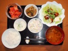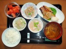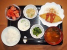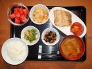 ごはん、味噌汁(白菜、しいたけ)、ほっけ塩焼き(トマト和え添え)、野菜玉子とじ(キャベツ、人参、しいたけ、玉ネギ、たまご)、ひじき五目豆煮、ピーマンの和え物(あげ、おかか)、フルーツ:スイカ |