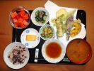 お赤飯(ごま塩)、味噌汁(豆腐、なめこ、三つ葉)、天ぷら盛合せ(さつま芋、かぼちゃ、アスパラ、いんげん、茄子、ピーマン、ししとう、竹輪いそべ)、酢の物(キュウリ、ワカメ、カニカマ)、厚焼きたまご、ゴーヤ炒め(豚肉、たまご)、フルーツ:スイカ |