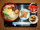 冷しうどん(細うどん、玉子焼き、キュウリ、紅白かまぼこ、カニカマ、椎茸煮、煮あげ、揚げ玉、カイワレ、ミニトマト、みょうが、長ネギ)、春巻、大学芋、フルーツ:スイカ |