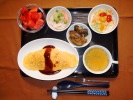 チキンオムライス(デミグラスソースがけ)、オニオンスープ(パセコン)、コールスローサラダ(キャベツ、人参、コーン、キュウリ、ミニトマト)、とうがんカニカマあんかけ、グリーンピース、茄子と豚肉のポン酢炒め、フルーツ:スイカ |