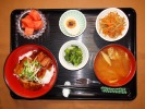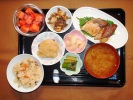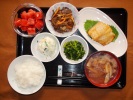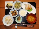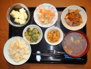 五目釜飯風ご飯、味噌汁(白菜、椎茸、しまじ)、ぶり照り焼き(大葉添え)、ぜんまい煮(人参、あげ、竹輪、こんにゃく、さつま揚げ)、ソフト揚げみぞれがけ(大根おろし、なめ茸)、白花いんげん豆煮、キュウリ中華炒め、フルーツ:スイカ |