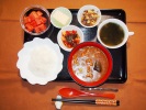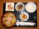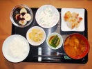 ごはん、味噌汁(とうがん、しめじ、あげ)、鱈の白身魚フライ(千切キャベツ)、かぼちゃいとこ煮、切干大根煮(人参、あげ、竹輪)、柚子風味玉子豆腐、フルーツ:柿、黄王リンゴ |