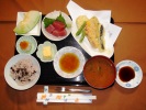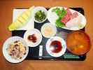 お赤飯(胡麻塩)、味噌汁(なめこ、豆腐、三つ葉)、天ぷら盛合せ(天つゆ、さつま芋、かぼちゃ、ナス、赤パプリカ、ししとう)、まぐろの刺身(大根つま、大葉、ワサビ)、里芋(柚子味噌がけ)、玉子焼き、フルーツ:キスミーメロン(青森産) |