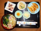 煮込みうどん(豚肉、白菜、椎茸、しめじ、あげ、小松菜、なると、長ネギ)、揚げギョーザ、里芋(柚子味噌がけ)、ゴーヤ炒め(豚肉、たまご)、厚焼きたまご、フルーツ:洋なし(ブルベーリーがけ) |