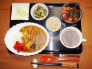 茄子ポークカレー(豚肉、人参、玉ネギ、揚げ茄子)、コンソメワカメコーンスープ、ぜんまい煮(あげ、竹輪、人参、さつま揚げ、こんにゃく)、トマト和風和え(わさび、白胡麻、刻み海苔)、たまご豆腐、フルーツ:スイカ |