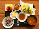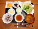 お赤飯(胡麻塩)、味噌汁(豆腐、なめこ、三つ葉)、天ぷら盛合せ(さつま芋、かぼちゃ、茄子、ピーマン、ししとう、オクラ、竹輪いそべ揚げ)、厚焼きたまご、金平牛蒡、フルーツ:イチゴ、キュウイ、生パイナッフル |