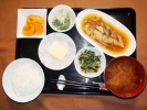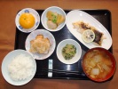 ごはん、味噌汁(とうがん、椎茸)、カラスがれいの煮付(ごぼう、しょうが)、ブロッコリーの胡麻ドレ和え、大根葉炒め(ちりめんじゃこ、おかか、白すり胡麻)、玉子豆腐、フルーツ:柿 |