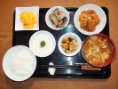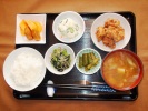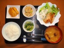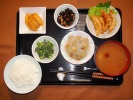 ごはん、味噌汁(白菜、あげ)、とりから揚げ(塩こうじ味、レタス添え)、うの花(人参、あげ、竹輪、さつま揚げ、しいたけ、長ネギ、枝豆、たまご)、さつま芋甘煮、ワカメ生姜煮、フルーツ:柿 |