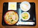 煮込みうどん(細うどん、豚肉、あげ、白菜、人参、しいたけ、しめじ、なると、長ネギ)、里芋煮(グリーンピース添え)、温泉たまご、フルーツ:生パイナップル |