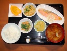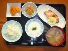 ごはん、味噌汁(白菜、椎茸)、ノルウェー産塩鮭焼き(カボス添え)、野菜の玉子とじ(キャベツ、人参、たまねぎ、たまご、三つ葉)、ほうれん草と人参のごま和え、はやと瓜の炒め物、フルーツ:宇和島産:富士柿 |