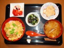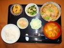カツ丼(豚ロースかつ、玉ネギ、たまご、グリーンピース)、味噌汁(白菜、椎茸、しめじ)、ソフト揚げ大根おろしがけ(なめたけ)、酢の物(キュウリ、ワカメ、カニカマ)、フルーツ:バナナ・いちご(ブルー・ベリー・ソース) |