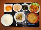 ごはん、味噌汁(大根、椎茸、あげ)、とりもも肉の照り焼き(レタス、サニーレタス、ポテトサラダ添え:人参、キュウリ、玉ネギ、ロースハム)、うの花(人参、椎茸、あげ、竹輪、さつま揚げ、枝豆、長ネギ、たまご)、小松菜とじゃこ炒め、フルーツ:柿 |