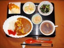 ポークカレーライス(豚肉、じゃがいも、人参、玉ネギ)、きのこビーフブイヨンスープ(椎茸、平たけ、マッシュルーム)、コールスローサラダ(キャベツ、人参、キュウリ)、酢の物(ワカメ、キュウリ、カニカマ)、白花のいんげん煮豆、フルーツ:柿とリンゴ |