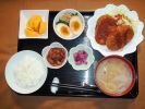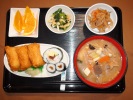 ごはん、味噌汁(豆腐、なめこ)、揚げギョーザ(レタス添え)、ほうれん草の胡麻和え、ひじき豆煮(あげ、人参)、大根おろしなめこ、フルーツ:柿 |