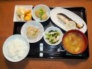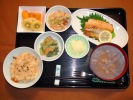 とりこぼうご飯、味噌汁(白菜、椎茸、しめじ)、鰆ゆうあん焼き、大根・人参・グリーンピース・大豆フレークのあんかけ、酢の物(キュウリ、ワカメ、カニカマ)、大根べったら漬け、フルーツ:リンゴ、キュウイフルーツ |