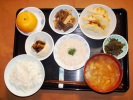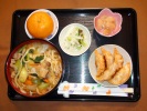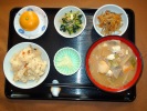 麦ごはん、とろろ芋(青のりがけ)、味噌汁(白菜、なめこ、あげ)、揚げギョウーザ、いもがら煮(人参、さつま揚げ、こんにゃく、あげ)、里芋田楽(田楽味噌、刻み柚子)、クキワカメ煮、フルーツ:みかん |