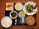 ごはん、味噌汁(白菜、なめこ、あげ)、中華ミートボール(サニーレタス、カイワレ、マヨネーズ)、ポテトサラダ(人参、キュウリ、ロースハム、玉ネギ、たまご)、大豆とひじきの煮物、はやとうりの中華炒め、フルーツ:柿、ゴールデンキュウイ |