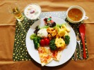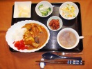 茄子ポークカレー(豚肉、じゃがいも、玉ネギ、人参、揚げ茄子、福神漬け)、とうがん色々きのこビーフスープ、コールスローサラダ(キャベツ、人参、キュウリ、コーン)、ブロッコリーの胡麻ドレ和え、うづら豆煮、フルーツ:りんご |
