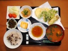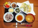 お赤飯(胡麻塩)、味噌汁(豆腐、なめこ、三つ葉)、天ぷら盛合せ(さつま芋、かぼちゃ、ピーマン、ししとう、春菊、茄子、竹輪いそべ揚げ)、厚焼きたまご、大根とシーチキン煮物(大葉添え)、くきワカメ煮物、フルーツ:いちご、メロン |
