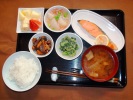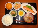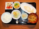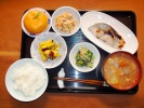 ごはん、味噌汁(白菜、あげ)、チリ産塩鮭焼き(カボス添え)、小松菜の胡麻和え、とうがん・カニカマあんかけ(グリンピース添え)、芋がら煮(こんにゃく、人参、さつま揚げ)、フルーツ:リンゴ、イチゴ・バナナ |