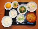 ごはん、味噌汁(白菜、なめこ、あげ)、とり肉とネギの塩こうじ焼き、マカロニサラダ(人参、キュウリ、玉ネギ、ロースハム)、ほうれん草のおひたし(おかかがけ)、ブロッコリーの胡麻ドレ和え、大根とシーチキンの煮物(大根葉添え)、フルーツ:みかん |