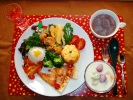 チキンライス、マルゲリータピザ、とりから揚げ、フライドポテト、ポテトサラダ、ブロッコリー、ミニトマト、サニーレタス、パセリ、ビーフスープ(とうがん、きのこいろいろ)、ヨーグルトフルーツ(いちご、バナナ、キュウイ、白桃缶、みかん缶)、クリスマスシャンパン |