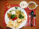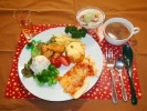 チキンライス、マルゲリータピザ、フライドチキン、ポテトサラダ、ポテトフライ、サニーレタス、ブロッコリー、ミニトマトパセリ、、赤・黄パプリカ、ビーフスープ(とうがん、いろいろきのこ)、ヨーグルトフルーツ(バナナ、キュウイ、いちご、白桃缶・みかん缶)、クリスマスシャンパン |
