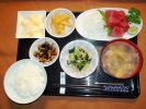 ごはん、味噌汁(白菜、しめじ、あげ)、本まぐろの刺身(大根つま、大葉、パセリ、わさび)、じゃがいも金平、小松菜炒め(あげ、えのき)、大豆とひじき煮、フルーツ:りんご |