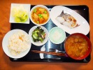 ごはん、味噌汁(白菜、あげ、しめじ、大根葉)、からすガレイのムニエル(柚子添え)、豚肉と大根の煮物(大根葉添え)、キャベツ・人参・三つ葉のおひたし(おかかがけ)、白花のいんげん豆煮、フルール:イチゴ、バナナ(ブルーベリーソースがけ) |