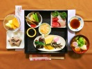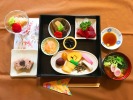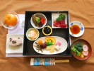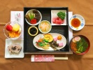 お赤飯(胡麻塩)、お雑煮(もち、とり肉、大根、人参、里芋、小松菜、なると、)、本まぐろと鯛の刺身(大根つま、パセリ)、煮しめ(八ッ頭芋、牛蒡、京人参、こんにゃく、絹さや)、黒豆煮、大根なます(柚子入り)、おせち(紅白かまぼこ、厚焼きたまご、数の子、栗渋皮煮、にしん、こぶ巻き)、フルーツ:柿、メロン |