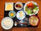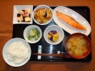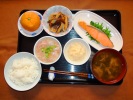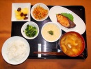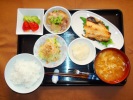 ごはん、味噌汁(白菜、椎茸、あげ、大根葉)、赤魚の西京焼き(大葉添え)、大根と豚肉の炒め煮(大根葉添え)、人参・キャベツ・三つ葉のおひたし(おかかがけ)、白花いんげん豆煮、フルーツ:りんごのコンポート(レーズン入り) |
