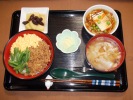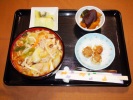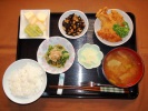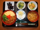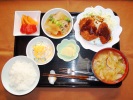 ごはん、味噌汁(かぶ、かぶ葉、しめじ、椎茸)、とろカツオの立田揚げ(パセリ添え)、ひじき豆煮(大豆、人参、あげ)、水菜(京菜)のおひたし(おかかがけ)、大根べったら漬け、フルーツ:リンゴ、キュウイフルーツ |