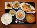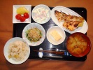 麦ごはん、味噌汁(白菜、なめこ、椎茸)、ぶりの照り焼き(大葉添え)、金平ごぼう(白胡麻がけ)、菜の花の辛子和え、大和芋(青のりがけ)、フルーツ:リンゴコンポート(レーズン(巨峰)入り) |
